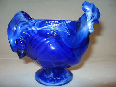 Cobalt blue milk slag glass hen / chicken egg cup toothpick holder dish rooster
