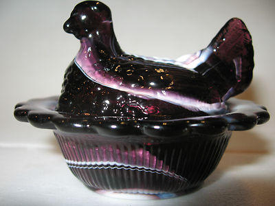 Title (ebay affiliate link): Amethyst and milk slag glass salt cellar hen chicken on nest basket dish purple