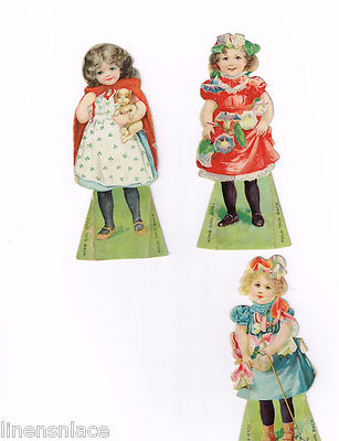 Title (ebay affiliate link): 5 Antique Worcester Salt Co. Girl Red Blue Flowers Dog Paperdoll Paper Doll