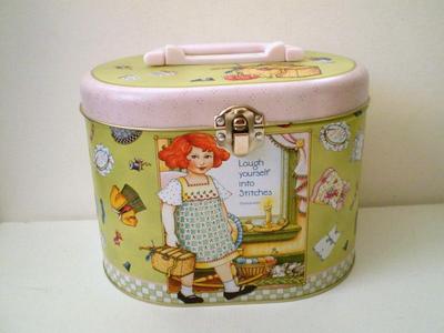 Title (ebay affiliate link): MARY ENGELBREIT SEWING BOX TIN-LAUGH YOURSELF INTO STITCHES-SHAKESPEARE