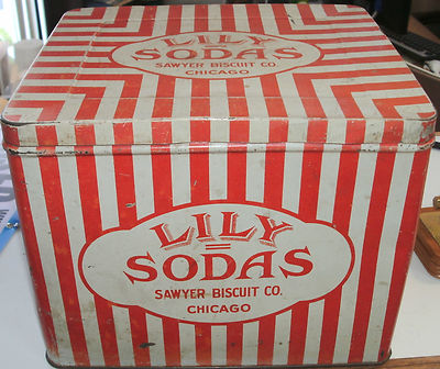 Title (ebay affiliate link): Vintage Lily Sodas Cracker Tin - Sawyer Biscuit company Chicago