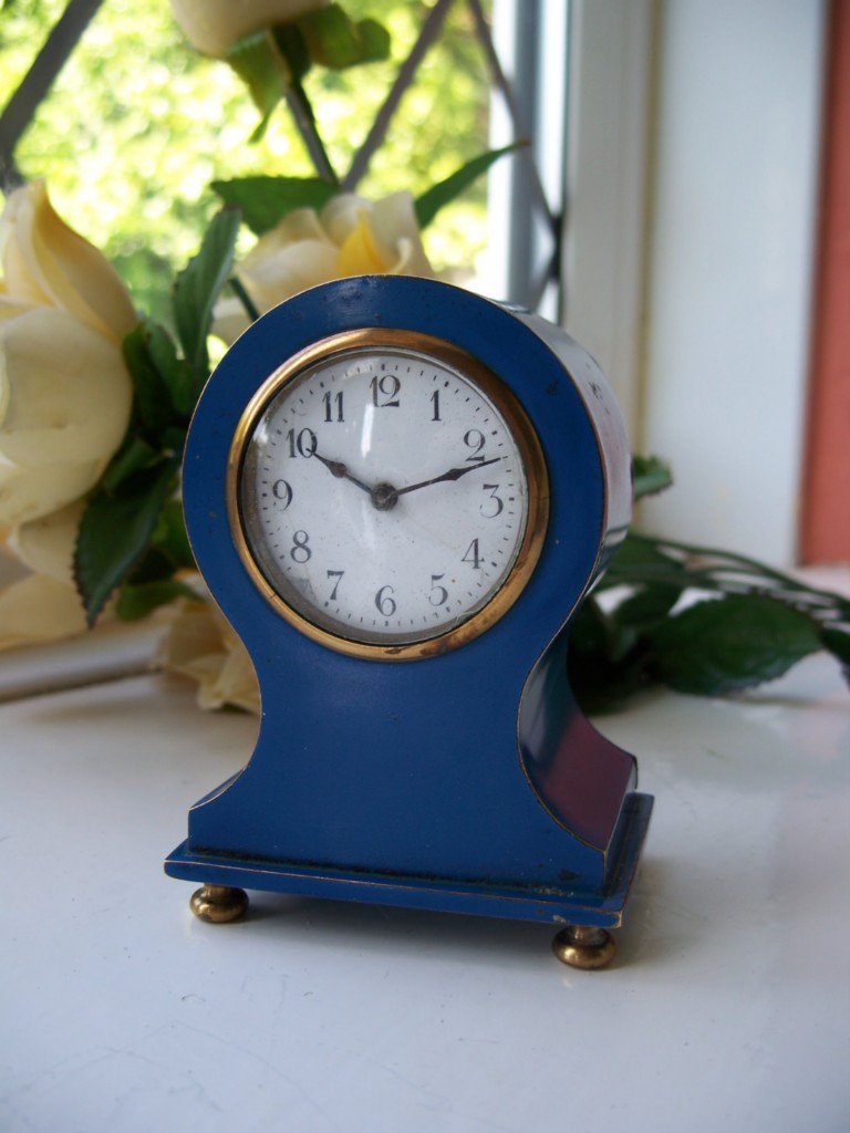 VERY SMALL ANTIQUE BLUE ENAMEL? H.A.C. ALARM CLOCK
