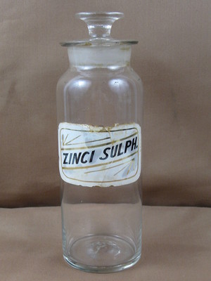 Title (ebay affiliate link): ANTIQUE APOTHECARY GLASS ZINCI SULPH BOTTLE JAR W/ LID HAND BLOWN