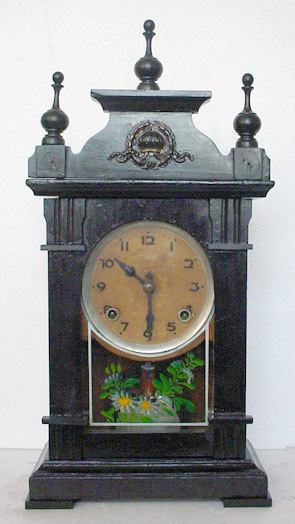 ANTIQUE 3 FINIAL CREST COLOR GLASS PANEL MANTLE CLOCK