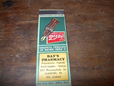 1928 Coca Cola Coke Universal Match St Louis Day's Pharmacy Glassport Pa.