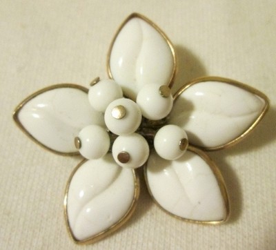 Title (ebay affiliate link): Vintage Estate FAUX MILK GLASS Goldtone FLOWER CLASSIC BROOCH PIN Adorable NEAT