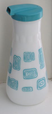 Title (ebay affiliate link): MID Century Milk Glass w/ BLUE ATOMIC DESIGN E-Z Por Juice Pitcher Carafe