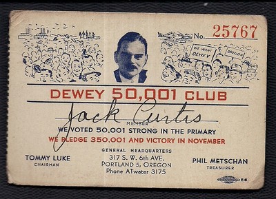 vintage portland,ore. presidential campaign 1944 "oregon thomas dewey club" card
