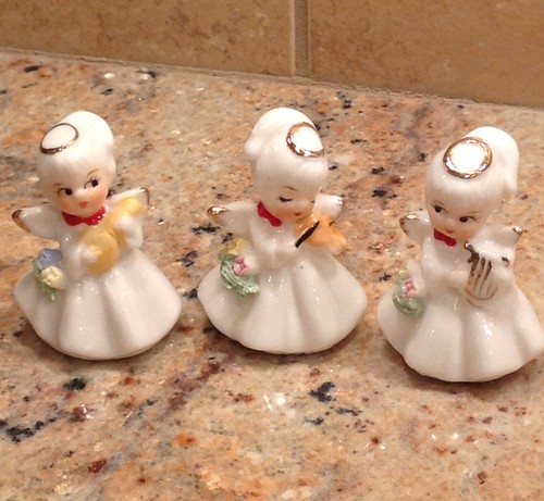 Title (ebay affiliate link): 3 Vintage Miniature Napco Angel Band Harp, Violin And Lute Pastel Spaghetti Trim