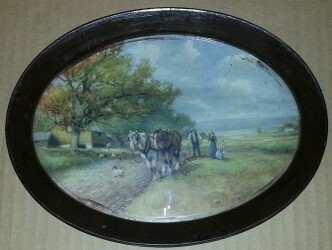 Title (ebay affiliate link): Antique Vintage 1930's Metal Tin Oval Picture Frame old pastoral print.