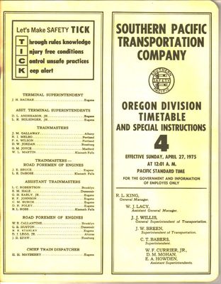 Vintage Southern Pacific Oregon Division Timetable #4 - April 27, 1975