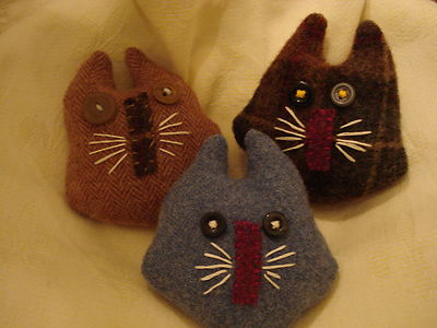Title (ebay affiliate link): 3 Primitive Cat Bowl Drawer Fillers Shelf Sitters Folk Art Old Wool Kitty Ornies