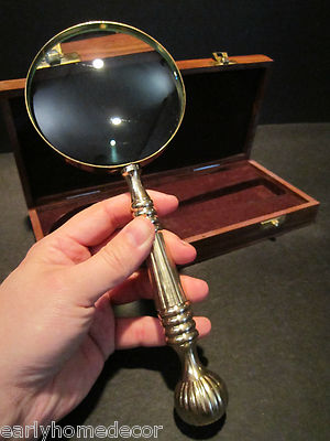 Title (ebay affiliate link): 19th C Antique Style Wood Box Brass Handle Magnifying Glass Hand Lens Desktop