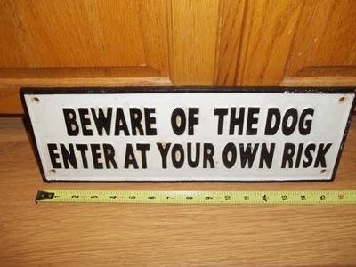 Title (ebay affiliate link): VINTAGE CAST IRON "BEWARE OF THE DOG, ENTER AT YOUR OWN RISK" GREAT COND,