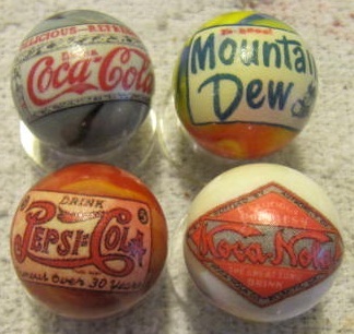 Title (ebay affiliate link): COCA COLA KOCA NOLA PEPSI MOUNTAIN DEW 1 inch size GLASS MARBLES + STANDS