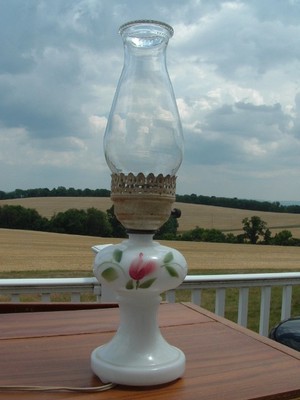 Title (ebay affiliate link): VINTAGE PINK & WHITE MILK GLASS TABLE LAMP W/ GLASS CHIMNEY WORKS! CUTE