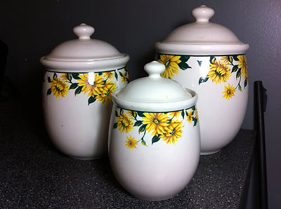 Title (ebay affiliate link): THOMSON POTTERY SUNFLOWER CONTAINER SET OF 3 SM- LARGE FLOWER SUGAR CONDIMENTS
