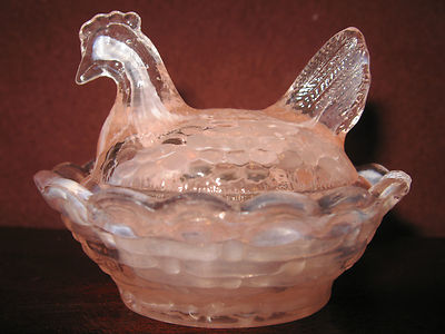 Title (ebay affiliate link): pink and milk slag glass salt celt hen chicken on nest basket dish rooster white