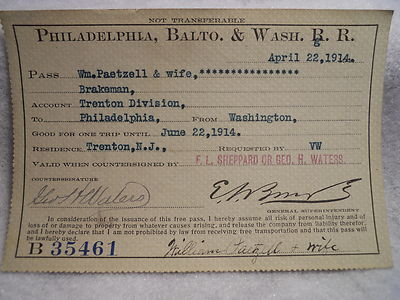 Title (ebay affiliate link): Vintage 1914 Philadelphia, Balto. & Wash. Railroad Trip Pass