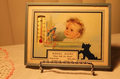 VINTAGE ADVERTISING THERMOMETER WITH SCOTTY DOG AND LITTLE GIRL BOISE IDAHO