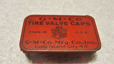 Title (ebay affiliate link): G.M. CO. TIRE VALVE CAPS IN ORIGINAL TIN...VINTAGE
