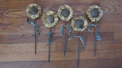 Title (ebay affiliate link): 5 QUILTED GOLD HANDMADE GRUNGED PRIMITIVE SUNFLOWER POKES FOR ANTIQUE CROCKS