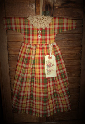 GRUNGY PRIMITIVE WALL~CUPBOARD DOLL DRESS PLAID HOMESPUN VALENTINE~FOLK~DECO