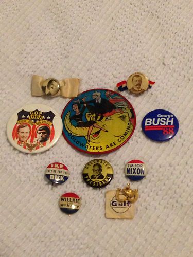 Title (ebay affiliate link): Lot of 10 Vintage Original Polticial Pins Nixion, Bush, Ike, Goldwater, & Etc.