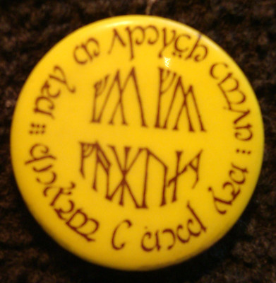 Title (ebay affiliate link): MIDDLE EARTH Language Hobbit Tolkien 1960's Hippie Pot LSD Peace Love Pinback