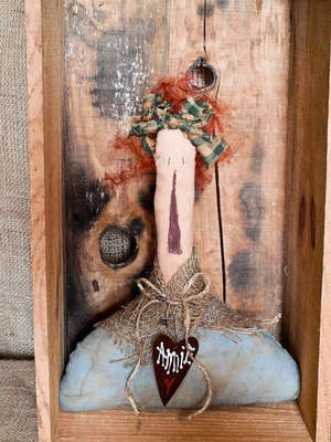prim grungy raggedy ann* annie black stump doll shelf sitter mustard rusty star