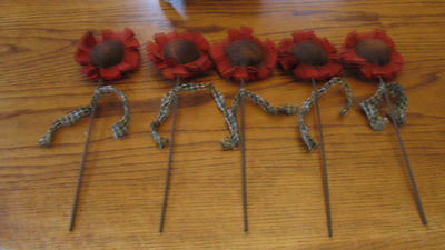 Title (ebay affiliate link): 5 BURNT ORANGE HANDMADE GRUNGED PRIMITIVE SUNFLOWER POKES FOR CROCKS, VASES