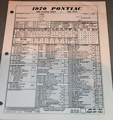 1970 Pontiac GTO LeMans order Form never used ORIGINAL