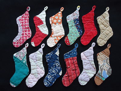 Title (ebay affiliate link): 12 PRIMITIVE VTG CUTTER QUILT CHRISTMAS SANTA STOCKINGS - FOLK ART