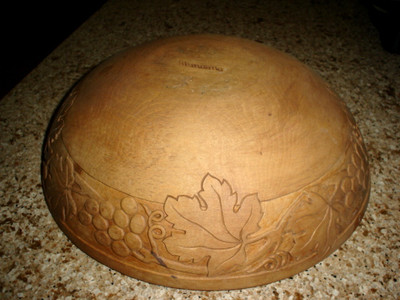 Title (ebay affiliate link): VINTAGE LARGE MUNISING SIGNED WOOD BOWL w/ Hand Carved Grapes & Leaves