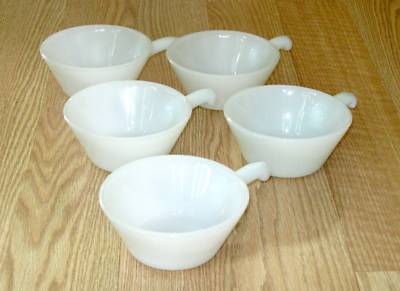 5x vintage FIRE KING milk glass HANDLED SOUP BOWLS USA