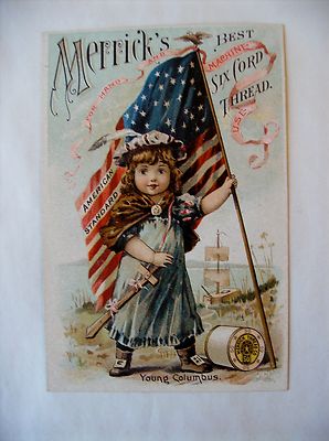 Title (ebay affiliate link): MERRICK'S SIX CORD THREAD VICTORIAN ADVERTISING CARD - GIRL & AMERICAN FLAG