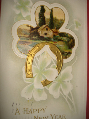 Title (ebay affiliate link): VINTAGE OLD holiday New Years POSTCARD Shamrocks Gold Horseshoe rural landscape