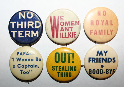 Title (ebay affiliate link): 1940 Willkie vs. Roosevelt President Campaign Button Political Pinback Pin Lot 6