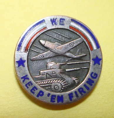 Title (ebay affiliate link): WWII OLDSMOBILE FACTORY EMPLOYEE "KEEP EM FIRING" PATRIOTIC PIN