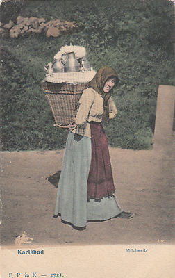 Title (ebay affiliate link): Sudetenland: very old picture postcard "Karlsbad - milchweib" (milkseller)