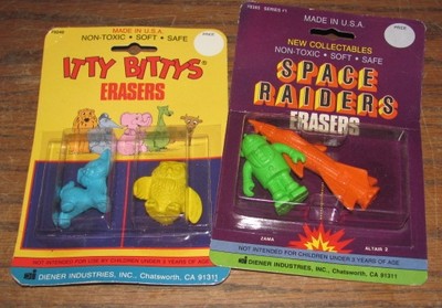 Title (ebay affiliate link): VINTAGE DIENER ITTY BITTY & SPACE RAIDERS ERASERS IN BLISTER PACKS NOS !