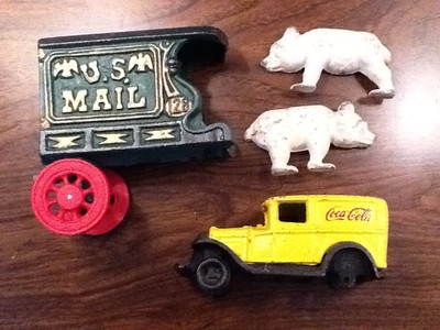 Title (ebay affiliate link): LOT OF 3 CAST IRON TOYS SALVAGE PARTS BEAR, U.S. MAIL TRUCK, COCA-COLA TRUCK