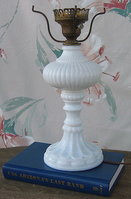 Title (ebay affiliate link): Ornate Heavy White Milk Glass Lamp ~ Missing Shade ~ Working Condition