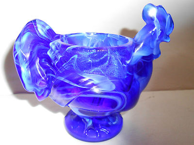Cobalt blue milk slag glass hen / chicken egg cup toothpick holder dish rooster