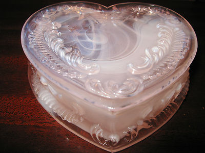 Title (ebay affiliate link): Pink & milk slag glass heart pattern powder jewelry box dresser tray holder ring
