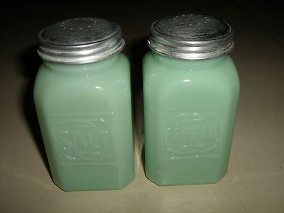 Title (ebay affiliate link): Vintage Jadeite Green Milk Glass Stove Top Salt & Pepper Shakers Metal Top