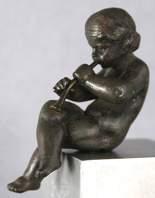 ESTATE - SMALL ANTIQUE CAST ZINC LEAD CLOCK FRAGMENT SCULPTURE CHILD AND HORN 4"