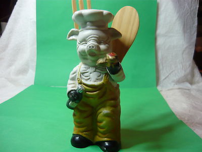 Old style Pig Chef utensil holder with wooden spoon and fork.