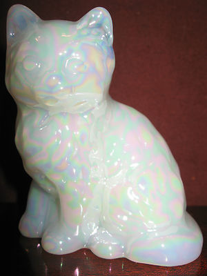 White milk carnival glass Cat Kitten paperweight / kitty iridescent art figurine