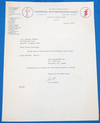 Title (ebay affiliate link): Signed NSRP J.B. Stoner Letter To Eustace Mullins Aryan Racist Thunderbolt Inc.